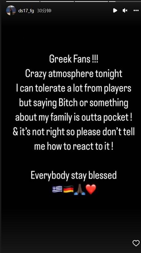 施罗德还透露他的家人惨遭辱骂,施罗德在Ins上更新动态,写道:疯狂的希腊球迷!!!今晚的氛围很疯狂,我可以忍受球员的垃圾话,但是用婊子或者其他词语谈论我的家人是不可接受的!这是不对的,所以请不要告诉我在这种情况下我该做出什么回应!祝福每一个人。