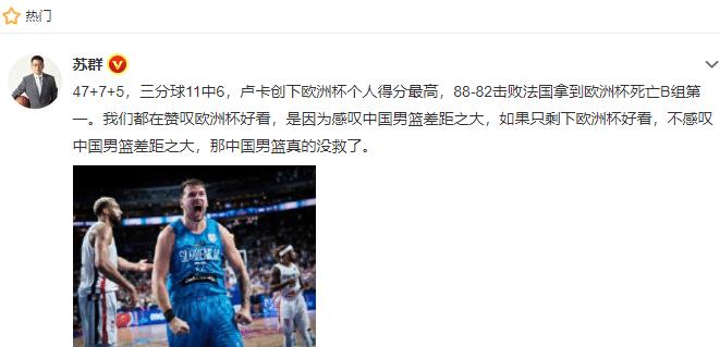知名篮球人苏群也盛赞东契奇,同时还让中国男篮躺枪,称:“47+7+5,三分球11中6,卢卡创下欧洲杯个人得分最高,88-82击败法国拿到欧洲杯死亡B组第一。我们都在赞叹欧洲杯好看,是因为感叹中国男篮差距之大,如果只剩下欧洲杯好看,不感叹中国男篮差距之大,那中国男篮真的没救了。 ”