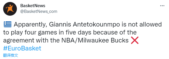 足球直播吧09月06日讯 欧洲杯小组赛希腊93-77大胜英国,雄鹿巨星字母哥轮休缺席比赛,因膝盖不适而休战吗?据美媒BasketNews报道,字母哥昨晚轮休的原因是希腊与雄鹿达成了协议,不允许他在五天内打四场及更多比赛;富尼耶呼吁给球员更多的休息时间,东契奇直言可能导致更多的伤病。