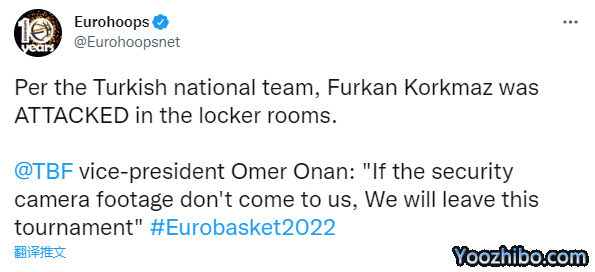 土耳其方面表示,球员去更衣室的途中不该受到攻击,我们与当地保安发生冲突,我们呼吁国际篮联,不要让任何人逃出处罚,要对肇事者进行惩罚,他们需要提供发生在球员通道中的冲突录像,否则我们将会退出欧洲杯。