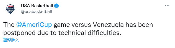 美洲杯小组赛,美国队上半场48-21领先委内瑞拉27分;不过由于比赛场馆出现重大故障,球馆漏水严重,本场比赛被迫延期;FIBA美洲杯官方和美国队官方都宣布了该消息。