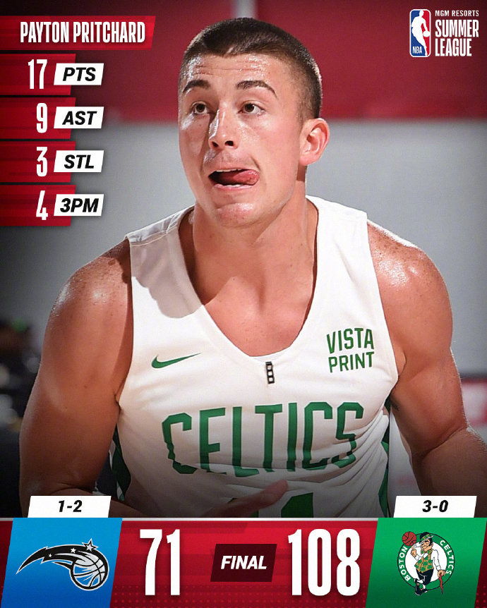 足球直播吧8月13日讯 NBA夏季联赛魔术对阵凯尔特人,开场后两支球队手感都不太理想,凯尔特人首先打开局面建立领先,第二节凯尔特人依旧保持稳定的发挥将分差拉大到两位数,特别是在半场结束前由爱德华兹、内史密斯和普理查德三人打出的攻势让绿军在半场结束时以50-31领先19分。下半场魔术表现依旧不太理想,萨格斯手腕酸痛没有再登场,凯尔特人不断拉大分差,最终凯尔特人108-71轻松战胜魔术。
