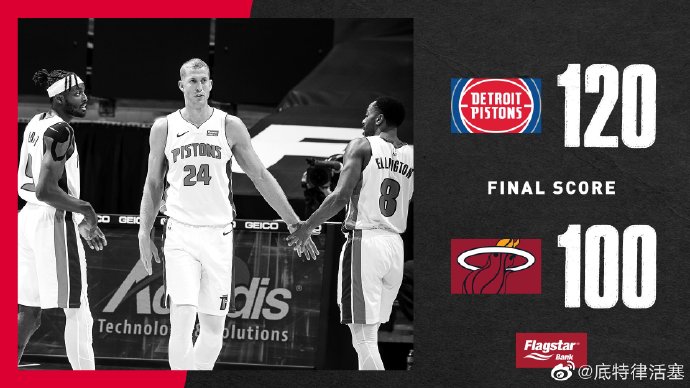 足球直播吧1月17日讯 热火坐镇主场迎战活塞,此役巴特勒、希罗因健康协议缺阵。两队上半场打得十分胶着,热火凭借纳恩和阿德巴约在次节末连续得分,以56-52稍稍领先结束半场。易边再战,热火在第三节命中率下滑,活塞则找到外线手感,格兰特、格里芬和罗斯等连中三分,活塞凭借凶猛的外线火力单节净胜19分,取得两位数领先。末节热火仍未找回进攻节奏,而活塞延续着手感,罗斯、约什-杰克逊和贝等一众替补再轰进三分,帮助活塞把领先扩大到20分以上,就此锁定胜局。最终,活塞在客场以120-100大胜热火,止住2连败的颓势,同时送给热火3连败。
