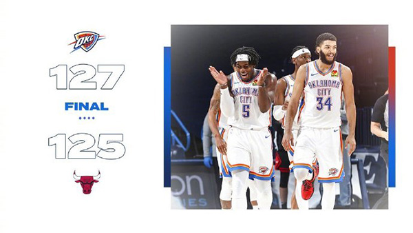 足球直播吧1月16日讯 NBA常规赛继续进行,近期两连败的雷霆客场挑战三连败的公牛,霍福德因为个人原因缺席,而公牛这边则悉数出战,首节一上来两队外线火热对飚,公牛多点开花确立优势,首节结束时他们暂时领先8分,次节回来,公牛外线手感火烫,末段他们再次打出8-0小高潮,半场战罢,公牛已经领先18分。易边再战后公牛连中三分继续扩大优势,但中段多特突然爆发单节独得15分,末段公牛多点开花稳住局势,三节结束时公牛继续领先8分,末节上来后亚历山大单节独得12分并打成关键2+1,雷霆轰出19-3攻击波抹平分差,拉文绝杀三分不中后比赛进入加时,加时赛中穆斯卡拉连中三分,拉文和怀特外线回应,拉文最后时刻绝杀三分不中,最终雷霆127-125险胜公牛。