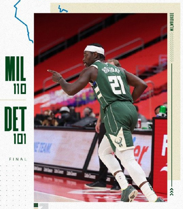 雄鹿:字母哥22分10板10助2断3帽、米德尔顿12分6助、霍勒迪21分6板5助3断、波蒂斯11分5板、福布斯13分