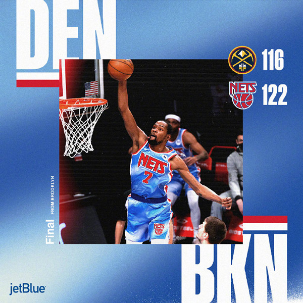 篮网:杜兰特34分9篮板13助攻,杰夫-格林8分2篮板,贾瑞特-阿伦6分5篮板2帽,乔-哈里斯15分4助攻3篮板3断,布鲁斯-布朗16分6篮板3助攻3帽,勒威尔20分5篮板6助攻,鲁瓦乌-卡巴罗11分2篮板,沙梅特5分4篮板