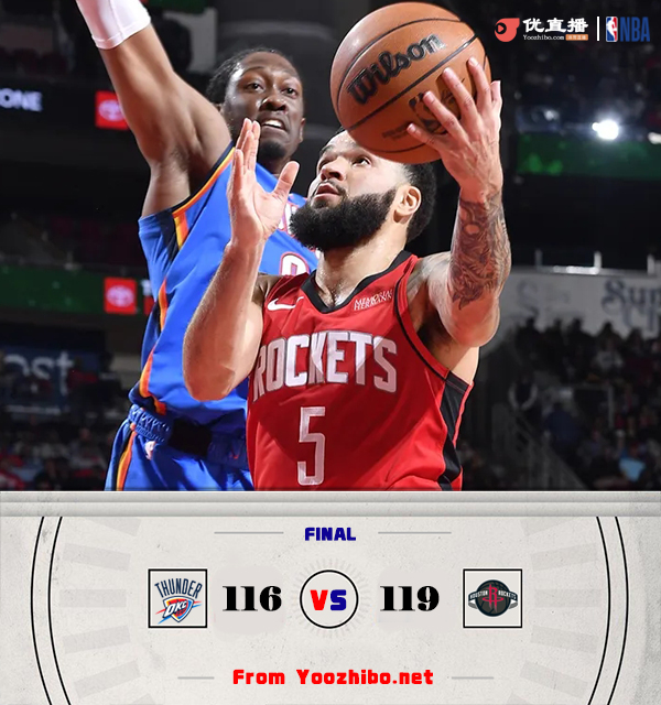 足球直播吧讯北京时间12月2日讯 NBA常规赛,火箭主场迎战雷霆,西部第一和第二迎来直接交锋。比赛开始,双方开场便陷入缠斗,比分交替领先,火箭多点开花,雷霆里突外投给出回应,次节火箭将分差拉开到两位数,雷霆连中三分还以颜色,范弗里特连得8分,半场战罢火箭62-60领先2分。易边再战,两队依旧打得难解难分,雷霆持续发力打出9-0的攻击波完成反超,末节火箭扳平比分,此后双方争夺陷入白热化,范弗里特连中三分,华莱士三分给出回应,狄龙和亚历山大抢球引发冲突,但狄龙争得关键球权且命中压哨,火箭119-116雷霆险胜过关。