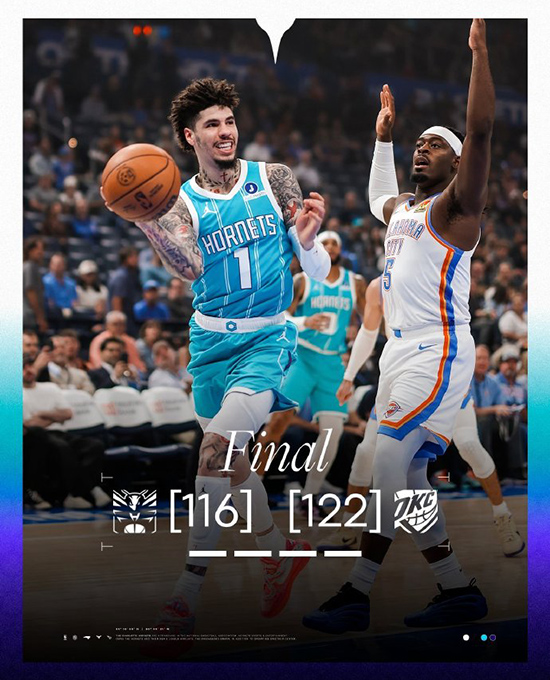 足球直播吧讯 北京时间10月10日 NBA季前赛,俄克拉荷马雷霆对阵夏洛特黄蜂。半场雷霆64-57黄蜂,最终雷霆122-116黄蜂。