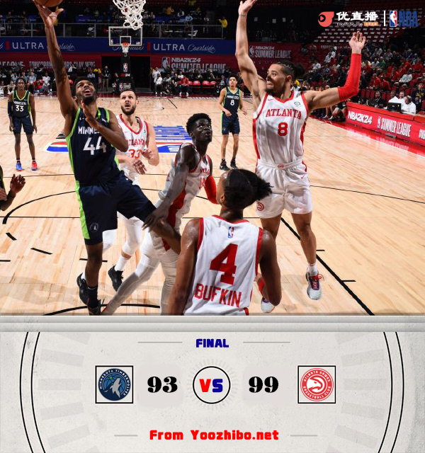 足球直播吧讯 7月13日讯 NBA夏季联赛,老鹰对阵森林狼。一开场,森林狼率先发力,连造杀伤开局9-2领先,老鹰轮番冲击篮筐拿分追赶,并且完成7-0的攻势反超比分,森林狼命中率持续下降,老鹰连中4记三分取得两位数优势,半场战罢老鹰50-40领先10分。下半场,双方围绕两位数的分差展开拉锯战,老鹰突然哑火,森林狼火力全开轰出24-7的进攻狂潮,此后老鹰及时回暖完成12-2的攻击波重夺领先,关键时刻泰瑞斯-马丁连投带罚拿到6分,老鹰虽连续罚球失手,但森林狼没能抓住机会。最终,老鹰99-93力擒森林狼。