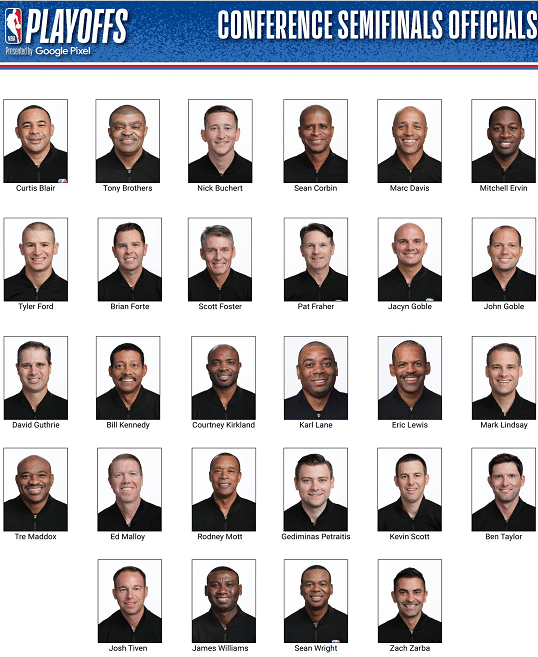 有湖人博主晒出了本赛季NBA季后赛分区半决赛裁判名单,同时表示要警惕争议哨的出现。
