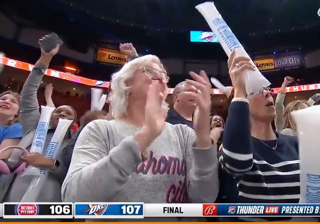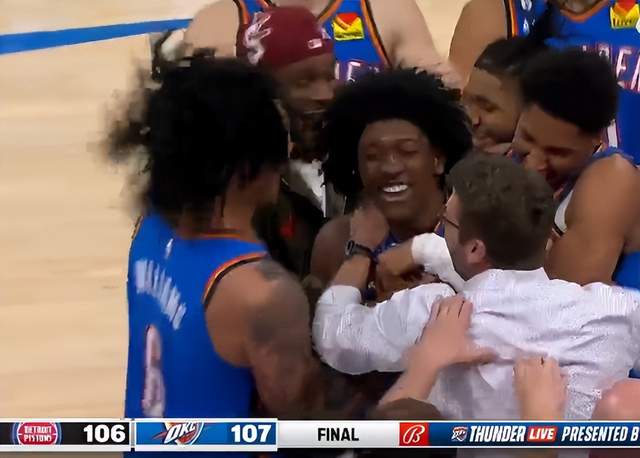 由于活塞此时已经没有暂停,活塞搏命的后场三分也未能命中,雷霆最终1分优势赢下比赛。此时,杰伦威廉姆斯非常激动,他在观众面前振臂高呼激情怒吼,庆祝这场比赛的胜利。而队友们则纷纷围上来,向他表示祝贺。而现场的雷霆主场球迷,也兴奋异常,纷纷起立鼓掌欢呼。