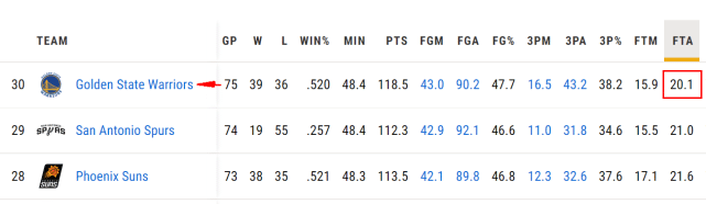 先来看一组对比数据,赛季至今,勇士场均罚球20.1次,排名联盟倒数第一,而他们的对手场均罚球25.4次,排在联盟第六。这样极端的罚球次数差距,让不少勇士球迷想要抱怨裁判。感觉就像是联盟在针对勇士,不让他们走上罚球线。事实真的如此吗?