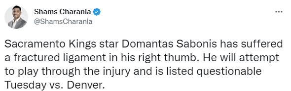足球直播吧12月27日讯,据名记Shams报道,国王球星萨博尼斯诊断为右手拇指韧带撕脱性骨折,他将尝试带伤上场比赛,在明天对阵掘金的比赛中列为出战成疑状态。