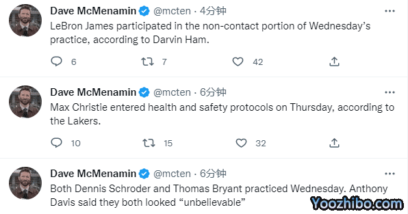 足球直播吧11月17日,湖人队最新伤情更新,湖人记者Dave Mcmenamin报道,詹姆斯参加了无接触训练,施罗德和托马斯-布莱恩特参加完整训练,湖人三大伤员有望下一场一起复出;另外湖人新秀克里斯蒂触发健康与安全协议。