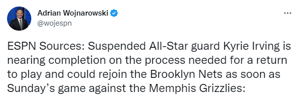 足球直播吧11月17日,欧文即将解禁复出,名记沃纳罗斯基报道,欧文即将完成重返球队的六项要求,累计至少禁赛8场比赛,进入归队的最后阶段,最快下周一复出对阵灰熊。