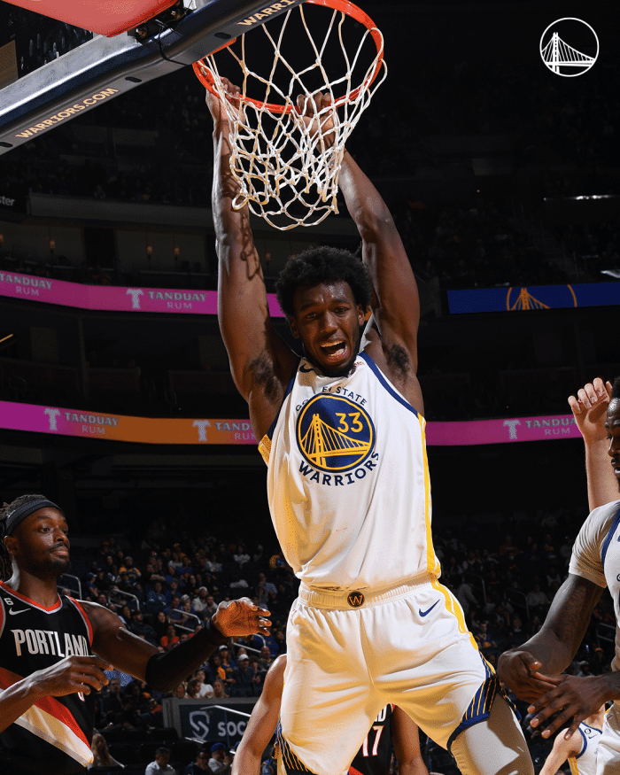 足球直播吧10月12日,NBA季前赛勇士打爆开拓者,库里、普尔、维金斯等主力轮休不打,勇士榜眼怀斯曼和穆迪都表现出色,穆迪上场23分钟12投6中轰下20分3篮板2抢断1盖帽;怀斯曼8投6中拿到18分7篮板2助攻1盖帽,肘击努尔基奇吃到恶犯,补扣2+1点燃库里。
