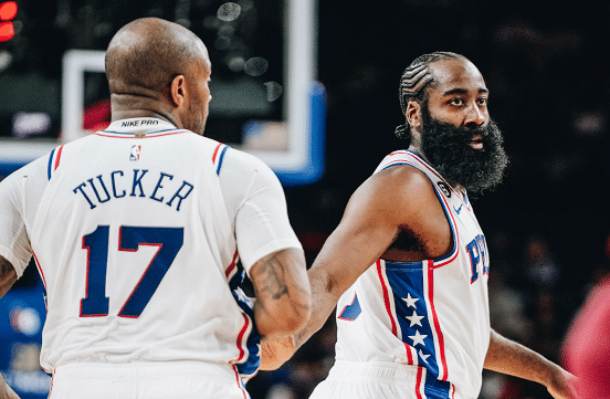 第三节,哈登增加了传球的次数,带动队友,他给到弧顶的哈里斯,后者出手三分命中。哈登左手突破,扛着贾瑞特-阿伦强硬上篮得分。这一节中段,哈登被米尔顿换下,之后便没有登场。