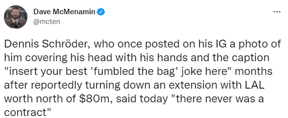 施罗德曾为湖人效力过一个赛季,外界曾报道施罗德拒绝湖人4年8000多万美元的续约合同,现在施罗德辟谣从未获得这样的合同;今夏施罗德重返湖人,此前由于签证问题,缺席了湖人训练营和四场季前赛。