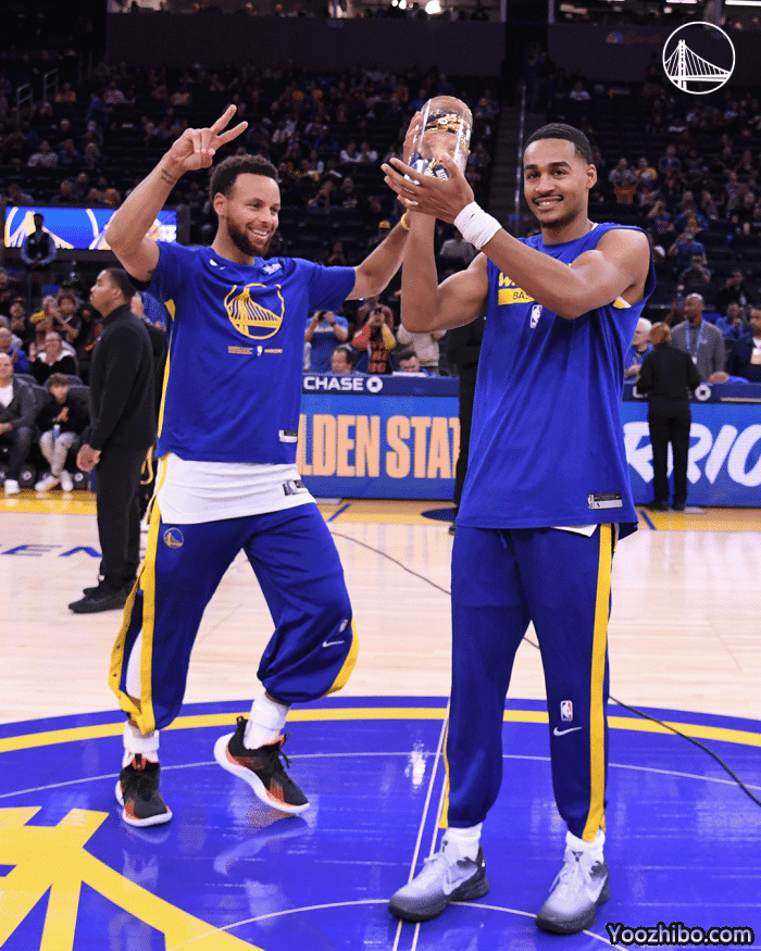 足球直播吧10月10日,NBA季前赛勇士主场对阵湖人,赛前,普尔正式领取罚球冠军奖杯,库里为队友颁奖并且站在普尔身后比2十分抢镜。