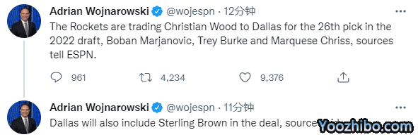 足球直播吧06月16日讯 ,据名记沃纳罗斯基报道,独行侠和火箭达成一笔5换1的大交易,独行侠送走博班、斯特林-布朗、特雷-伯克、克里斯以及今年首轮26号签,从火箭引援伍德;这是一笔双赢的交易,独行侠补强内线,火箭腾出空间并且获得选秀权。