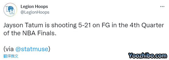 据统计,在今年总决赛前五场比赛中,塔图姆末节累计21投5中,命中率仅仅只有24%;前五战比赛最后五分钟,塔图姆一共只得到3分,相当于5战最后25分钟仅得3分,还不如绿军替补球员科内特,G2和G5在垃圾时间上场,贡献5分。