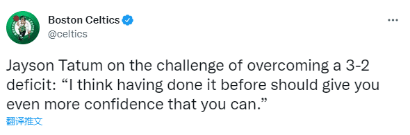 对于2-3落后,塔图姆表示:此前我们有2-3落后过,但我们完成了翻盘,这给了我们自信心,我们可以做到。