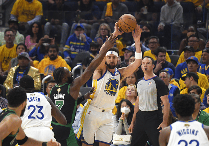 足球直播吧06月14日讯 ,勇士和凯尔特人总决赛天王山关键一战,勇士上半场领先12分,但第三节被凯尔特人打出19-4的超级攻势;在塔图姆和杰伦-布朗的带领下,绿军下半场疯狂反扑,期间斯玛特夹住两人的挡拆一幕引争议,库里向裁判示意抱怨被无视。