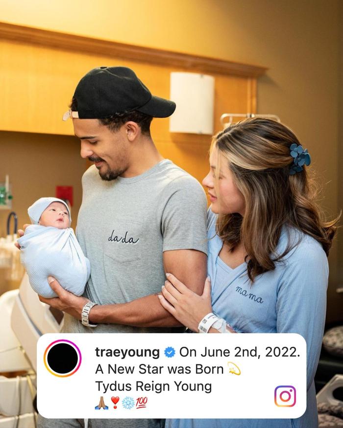 足球直播吧06月04日讯 ,老鹰球星特雷-杨宣布一大喜讯,他的第一个儿子出生,因此23岁特雷-杨正式升级为爸爸;吹杨在社交媒体上晒出多张照片,并且配文写道:2022年6月3日,一个新星诞生了,孩子的名字是Tydus Reign Young。