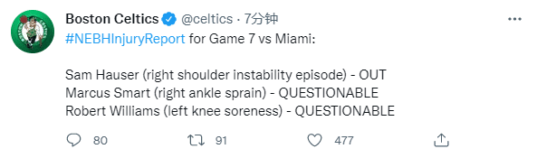 凯尔特人官方更新伤情,斯玛特(右脚踝扭伤)、罗伯特-威廉姆斯(左膝酸痛)出战成疑(50%出场可能),豪瑟(右肩伤势)继续缺席比赛。