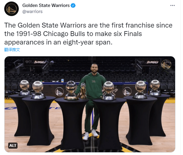 足球直播吧05月28日讯 勇士西决4-1淘汰独行侠从而夺得西部冠军,时隔3年重返总决赛,8年6进总决赛创纪录;勇士官方晒出库里霸气合影7座奖杯的照片,配文写道:勇士成为1991-98公牛王朝之后第一支8年6次晋级总决赛的球队;勇士官推还霸气喊话:我们回来了!