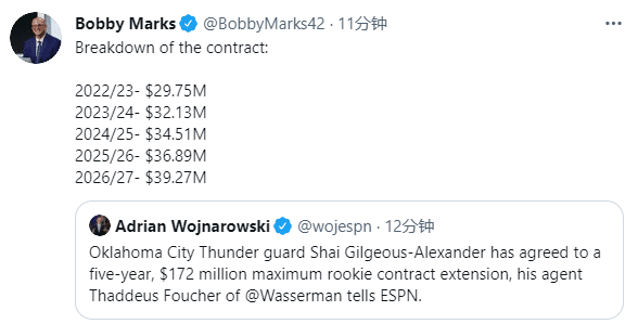 除了特雷-杨,2018届的球员雷霆新星亚历山大(18年首轮11号秀)也拿到提前续约合同,他和雷霆提前续约5年1.72亿美元大合同,这份合同的细节是——22-23赛季2975万美元、23-24赛季3213万美元、24-25赛季3451万美元、25-26赛季3689万美元和26-27赛季3927万美元。
