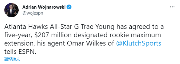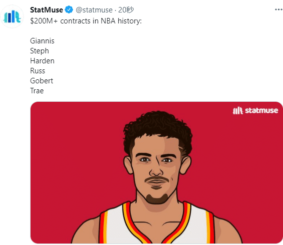 特雷-杨(18年首轮5号秀)提前续签5年2.07亿美元大合同创纪录,比肩字母哥、库里、哈登、威少和戈贝尔成为NBA史上第六位签下至少2亿美元的球员。