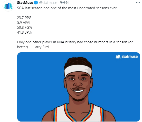亚历山大场均拿到23.7分5.9助攻50.8%投篮命中率和41.8%的三分命中率,伯德之后历史第二人。