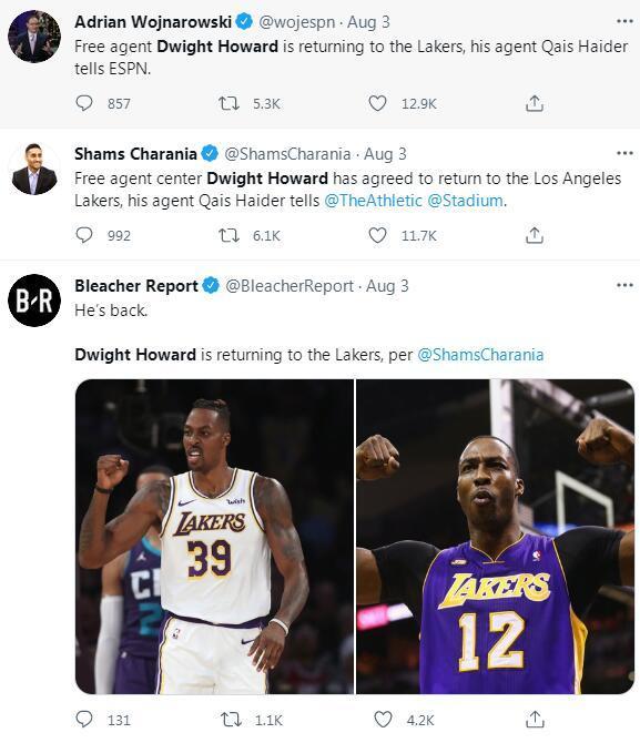 8月3日,名记WOJ和SHAMS联合报道表示,在湖人队和自由球员霍华德接触之后,霍华德表示愿意重新回到湖人,双方将签订一份一年的合同,显然上赛季还能拿到7+8数据的霍华德回归将是对于湖人队内线最大的提升,最最关键的是,霍华德价钱还便宜,或许霍华德的加盟也会让准备离开的小加索尔有再看一看的心态。