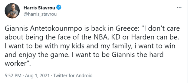 足球直播吧讯 北京时间8月2日,字母哥带着总冠军奖杯和FMVP奖杯回到祖国希腊,并接受了希腊媒体的采访。在采访中,字母哥坦言自己并不在乎是否成为联盟的门面球星,他认为杜兰特或者哈登可以扮演这个角色。