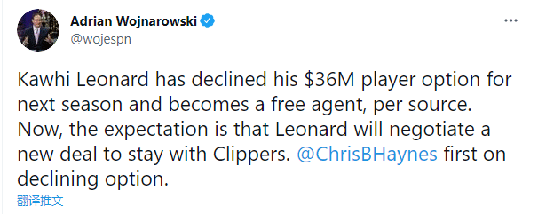 足球直播吧讯 北京时间8月2日,据ESPN名记沃纳罗斯基报道,快船球员莱昂纳德已经拒绝执行下赛季3600万美元的球员选项,这使其成为完全自由球员;预计他将和快船重新签下一份合同。