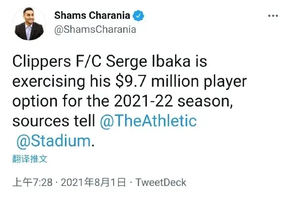 据爆料王Shams透露,伊巴卡决定执行下赛季价值970万美元的球员选项。