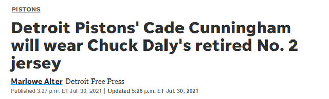 坎宁安在大学就身穿2号球衣,而来到活塞,他被特许继续身披这个号码,即便这个号码已经被退役。“我要特别感谢希德利-戴利,感谢戴利家庭允许我继续穿大学的这个号码。这是一项特殊的荣誉,我对此满怀感恩和敬意。”坎宁安在见面会上说道。