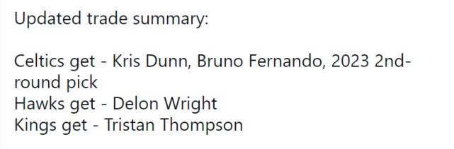 足球直播吧讯 北京时间7月31日,国王、凯尔特人和老鹰正式达成了一笔3队5人交易协议。凯尔特人得到老鹰的后卫克里斯-邓恩、前锋费尔南多、2023年的次轮签(来自老鹰),国王得到凯尔特人的中锋特里斯坦-汤普森,老鹰得到国王的后卫德朗-莱特。