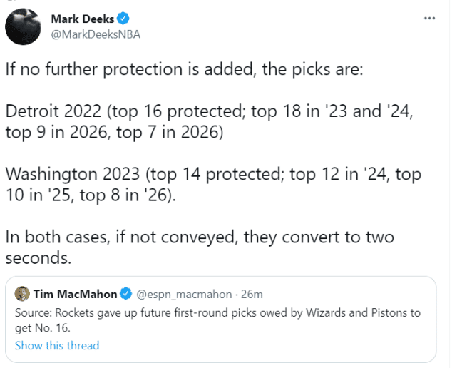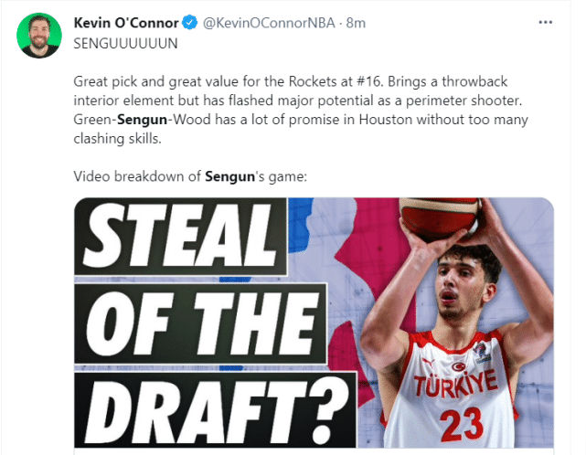 足球直播吧讯 北京时间7月30日,2021年选秀大会上,火箭用未来的两个受保护的首轮签(来自活塞和奇才),换来雷霆的首轮第16号签,并用16号签选中了土耳其超级联赛MVP阿尔佩伦-申京。NBA名记奥康纳感慨火箭这次选择大赚。