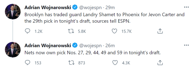 足球直播吧讯 北京时间7月30日,据ESPN名记沃纳罗斯基报道,篮网和太阳达成了一笔1换2的交易协议。他们将沙梅特送至太阳,换回杰文-卡特和今年的29号签。这样一来,篮网在今天的选秀大会上拥有27号签、29号签、44号签、49号签和59号签。