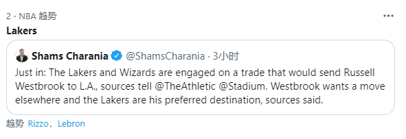 威少又被交易了,他成为NBA史上第一位被连续三年交易的MVP球员;2019年,威少申请交易并被雷霆交易到火箭,和哈登仅在休斯敦合作一年便解体;2020年,威少被火箭交易到奇才,如今威少被交易到湖人,威少如愿回到洛杉矶打球。