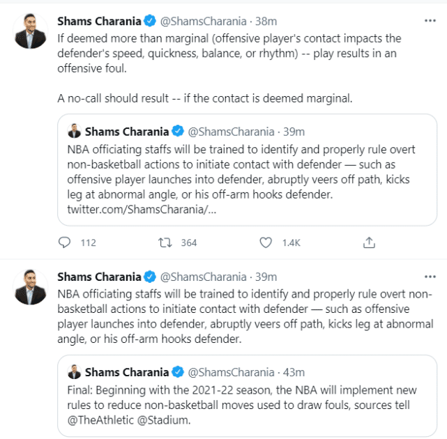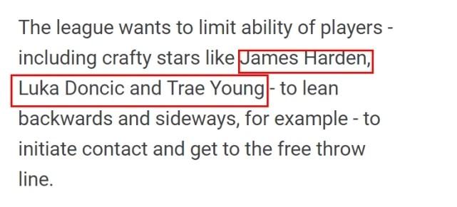NBA官方的这一调整,很快引起热议。此前美媒报道NBA开会讨论修改规则时,就曾经点名三位球星,并指出NBA修改规则是为了限制他们的造犯规行为,这三位被点名的球星是篮网的哈登,独行侠的东契奇和老鹰的特雷-杨。他们在进攻中不时使用一些非篮球动作造犯规,多次引起球迷热议。