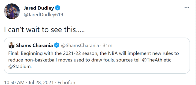 湖人球员杜德利第一时间转发查拉尼亚的报道,并评论道:“我已经等不及看到这一幕了。”显然,杜德利很反感那些造犯规的非篮球动作,看到联盟终于正式改变,他显得很开心。