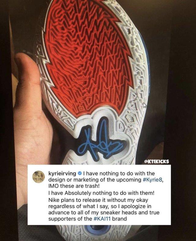 在自己的社交媒体上,欧文自己表示,即将发售的欧文8代的设计和营销和我无关,在我看来这些都是垃圾,我和它们没有任何关系,无论我说什么,耐克都计划出售他们,所以我提前向球迷们道歉。