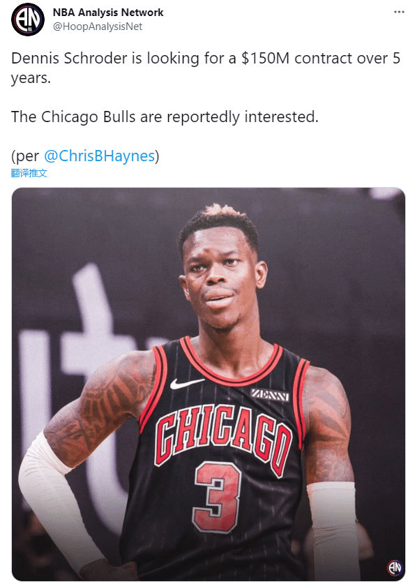 足球直播吧讯北京时间7月27日,据名记ChrisHaynes的报道,湖人球员丹尼斯-施罗德正在寻找一份5年1.5亿美元的续约大合同,平均年薪高达3000万美元;名记还透露芝加哥公牛有意引援施罗德。