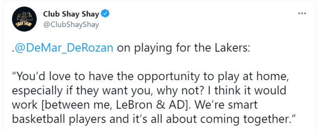 足球直播吧讯 北京时间7月27日,即将成为自由球员的德罗赞,在一档节目中正式表态,愿意回到家乡洛杉矶打球,并相信自己和詹姆斯、浓眉能产生很好的化学反应,能够一起冲击总冠军。