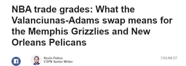 ESPN评级3换5大交易!鹈鹕一举三得评B+ 灰熊为选秀发力评B