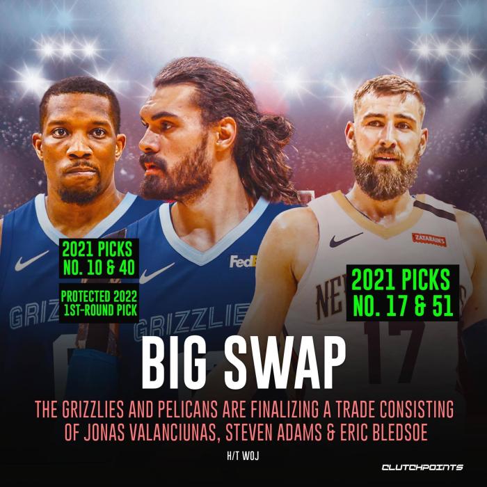 5换3大交易达成!鹈鹕将亚当斯布莱德索交易到灰熊,引援17+12中锋