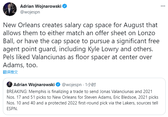 沃纳罗斯基还表示,新奥尔良鹈鹕创造了8月份的工资帽空间,允许他们匹配任何与郎佐-鲍尔的报价,或者让他们有足够的工资帽空间去追逐一名重要的控球后卫,包括凯尔-洛瑞和其他人。鹈鹕也喜欢用瓦兰丘纳斯替代亚当斯。